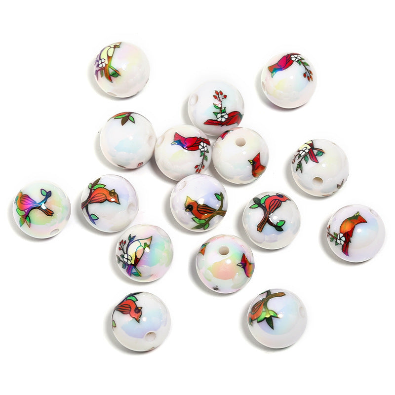 Electroplated solid color round beads with woodpecker animal print for DIY jewelry, phone charms, and craft accessories.